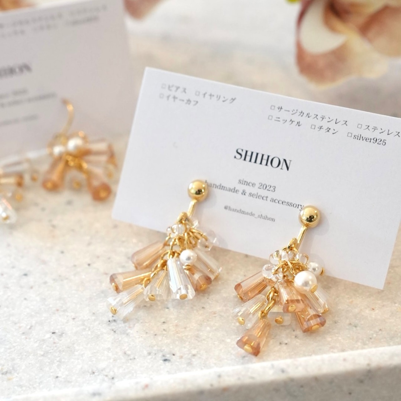 透明感あるオーロラのガラスビーズを組み合わせ、まるで花びらが舞うような軽やかなシルエットに仕上げました*。