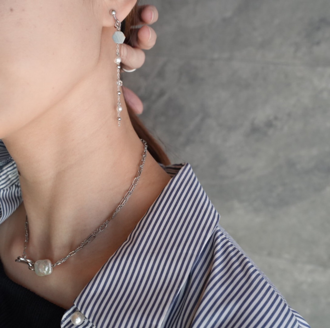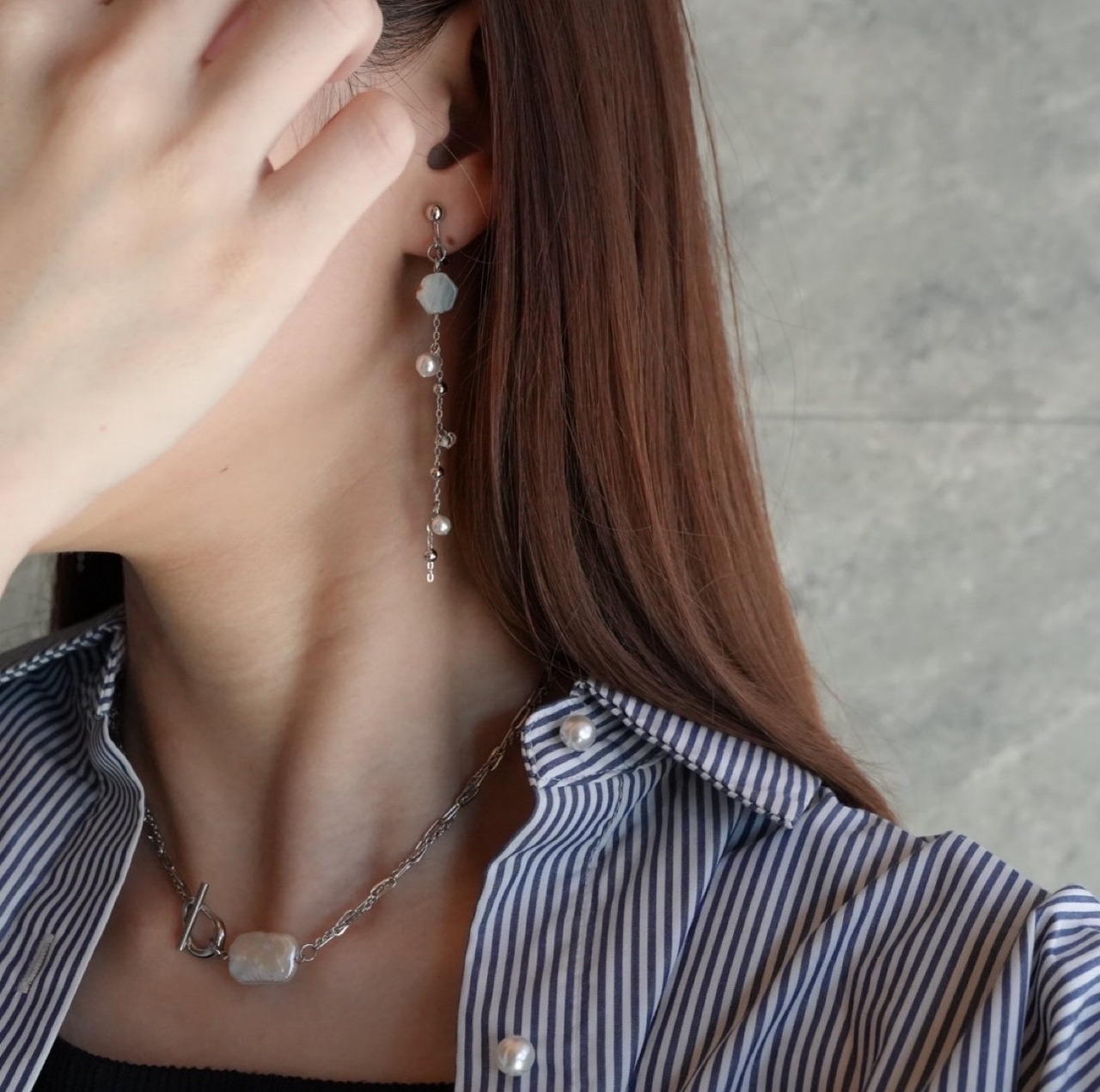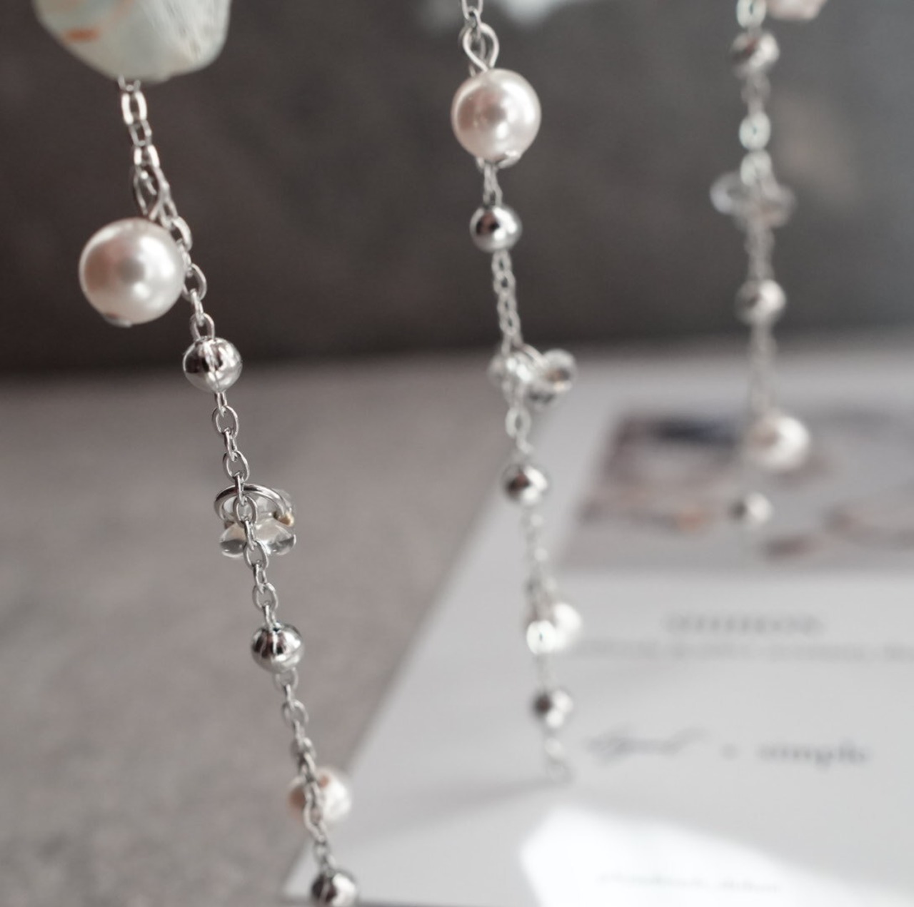 パールとクリアビーズをあしらったチェーンは、揺れるたびに涼しげな印象に。