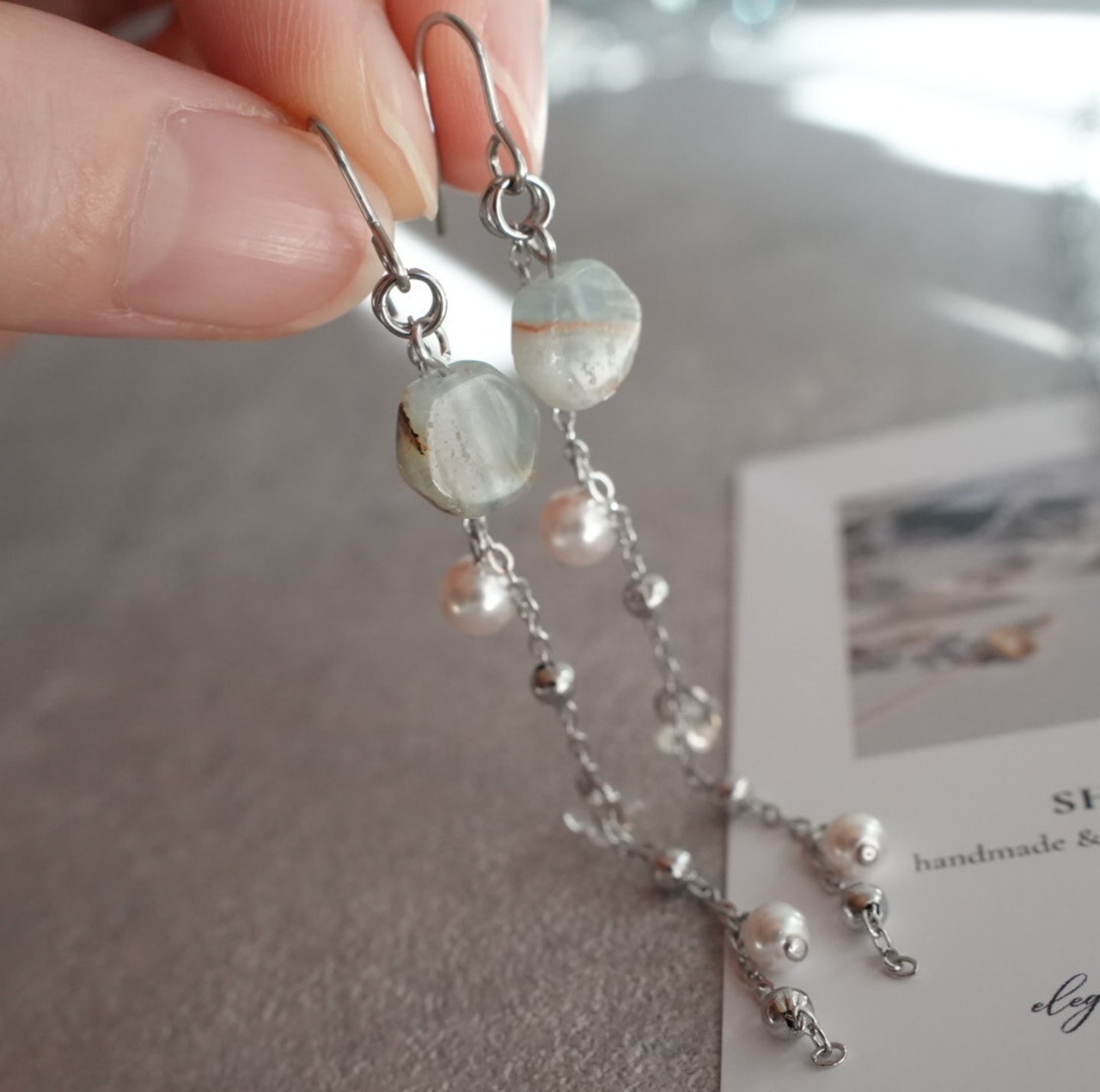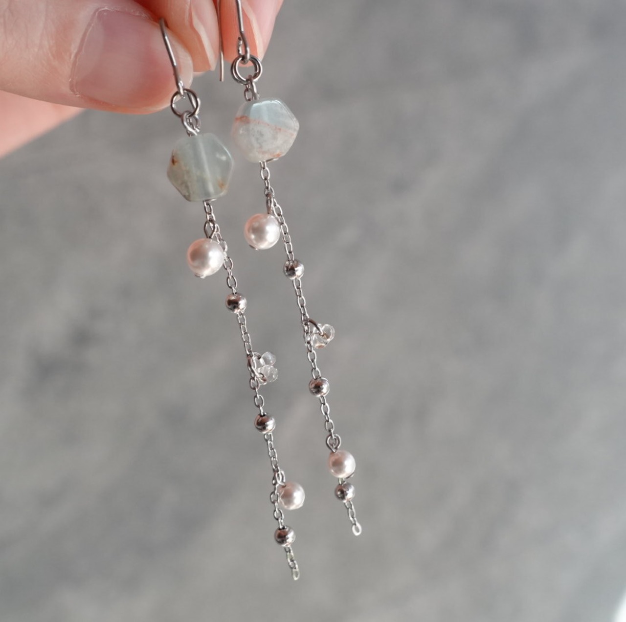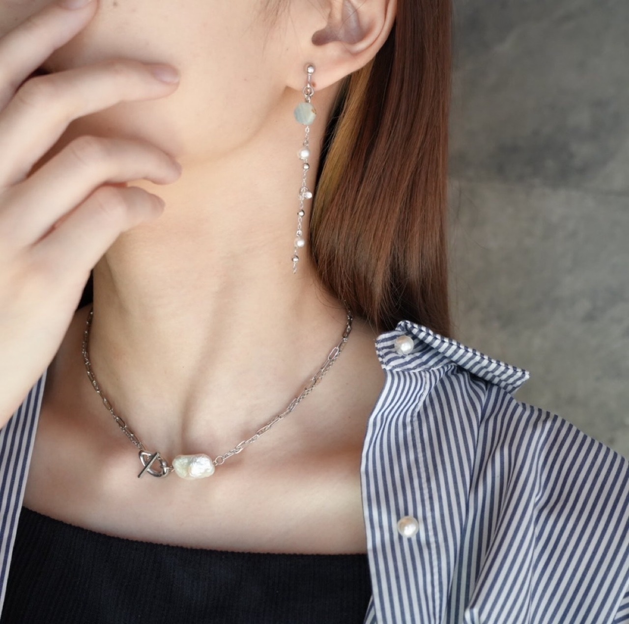 パールとクリアビーズをあしらったチェーンは、揺れるたびに涼しげな印象に。