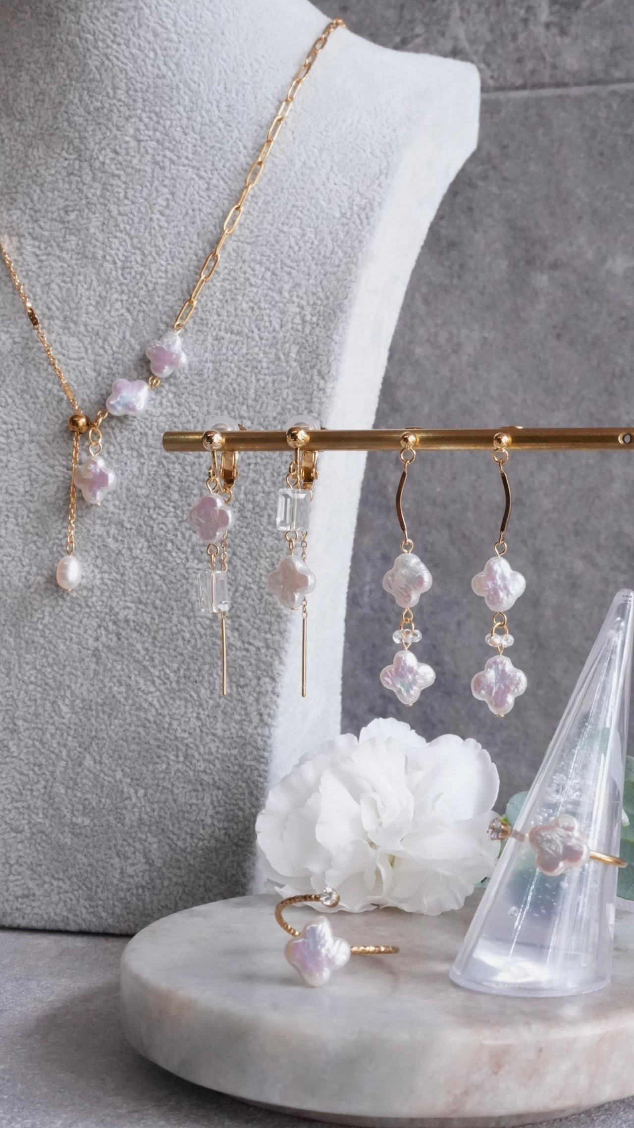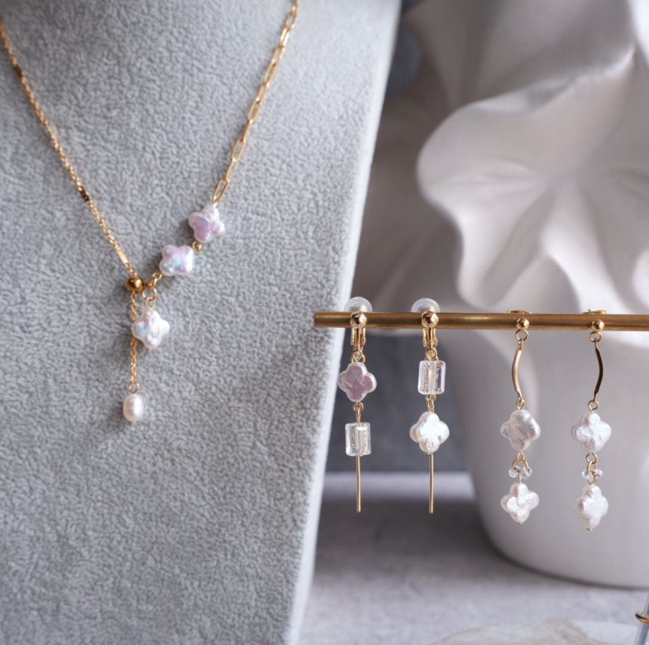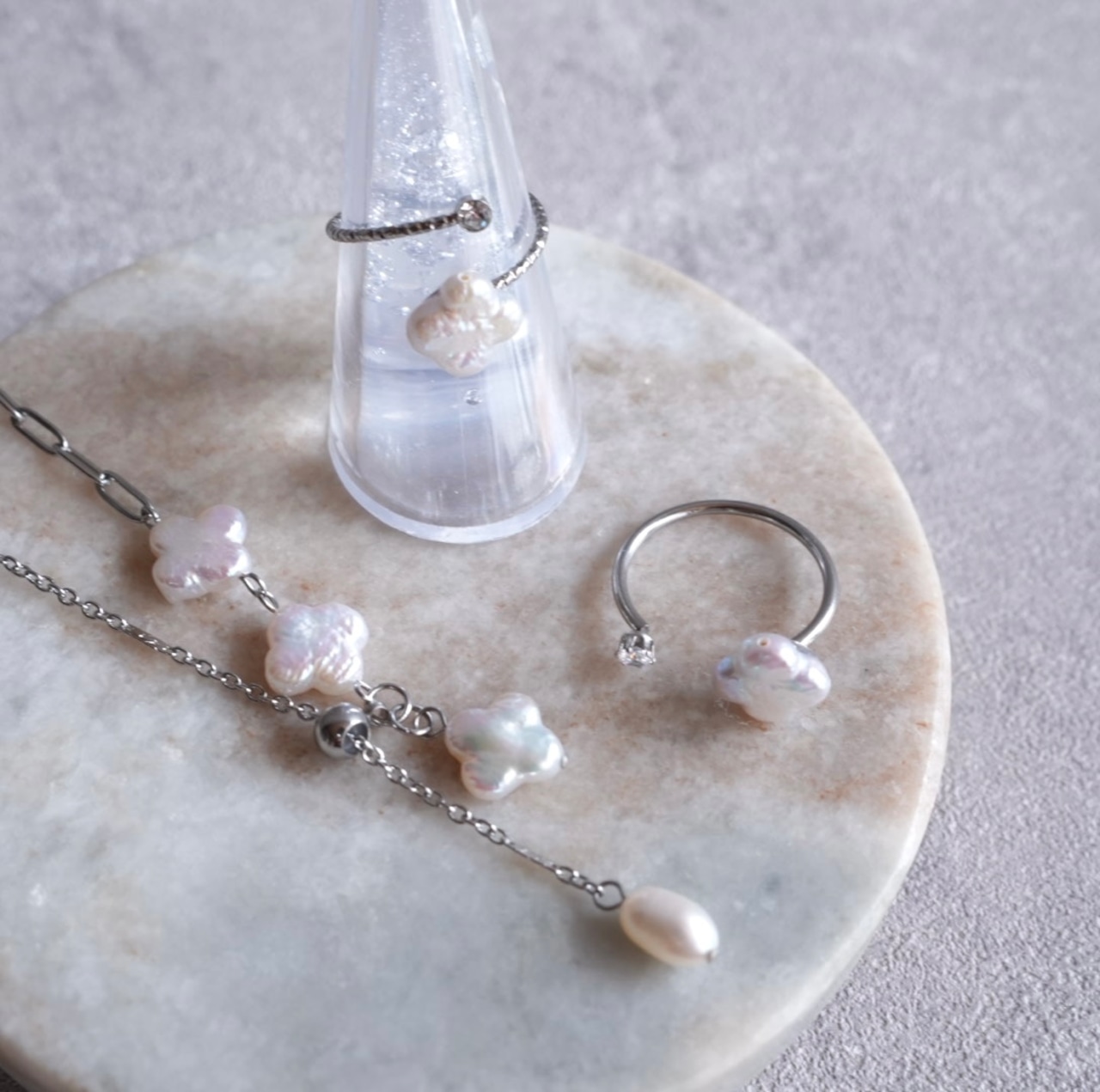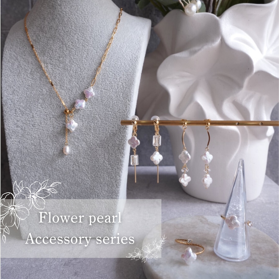 花のように形づくられた淡水パールを使用したアクセサリーシリーズ