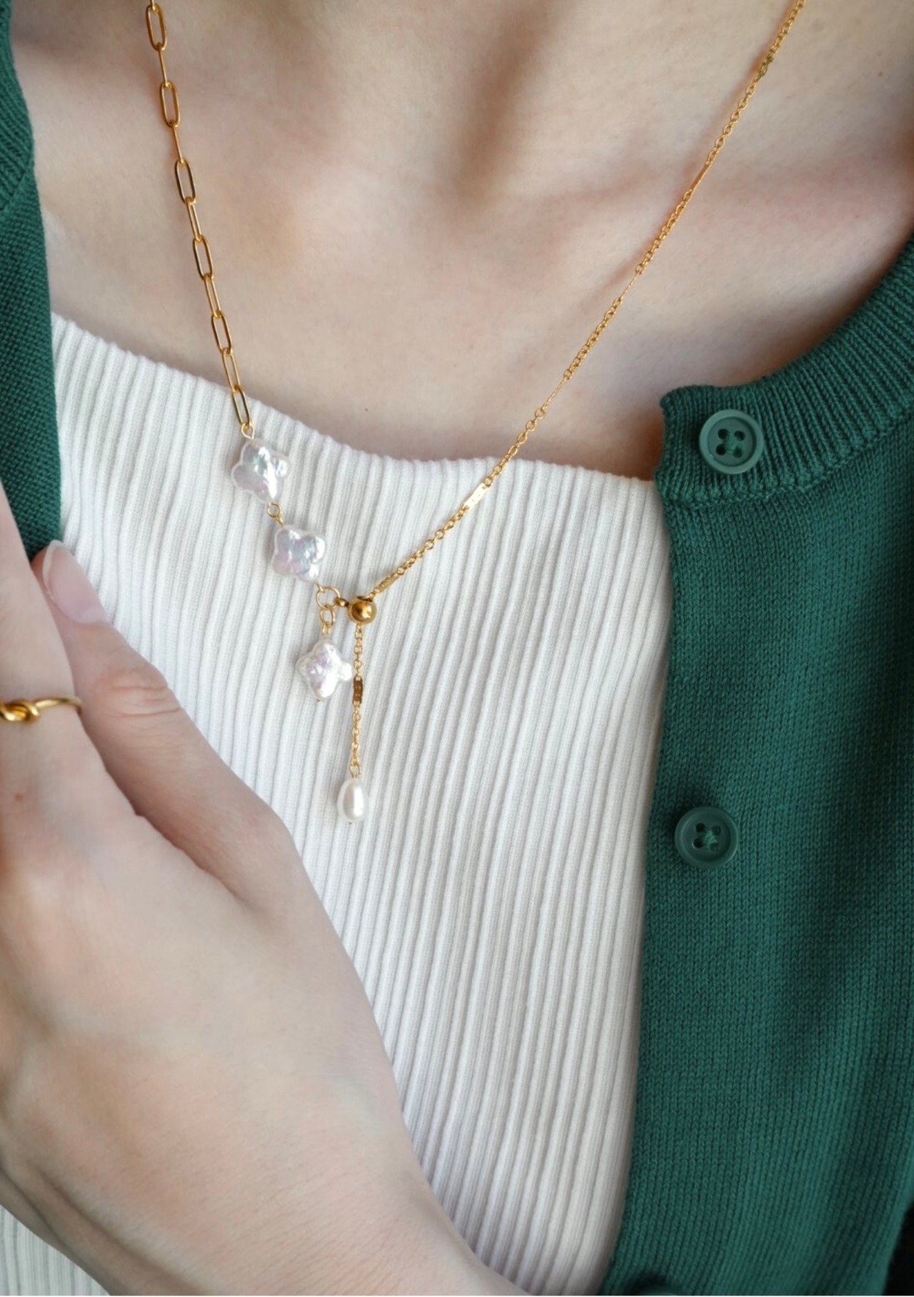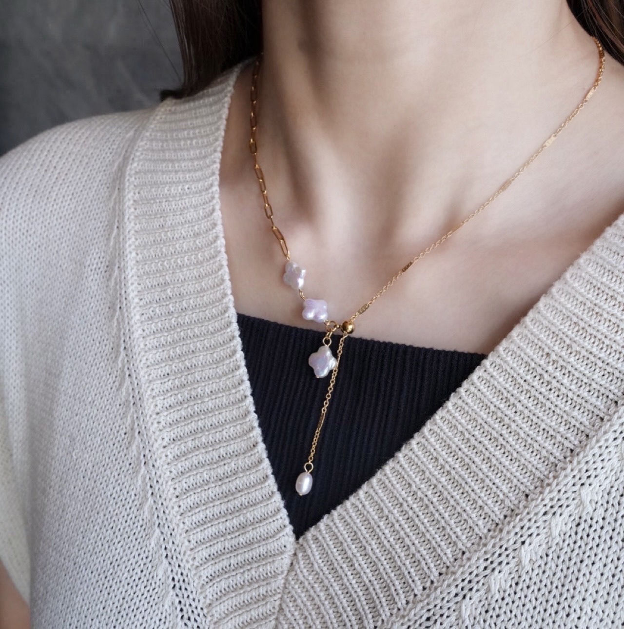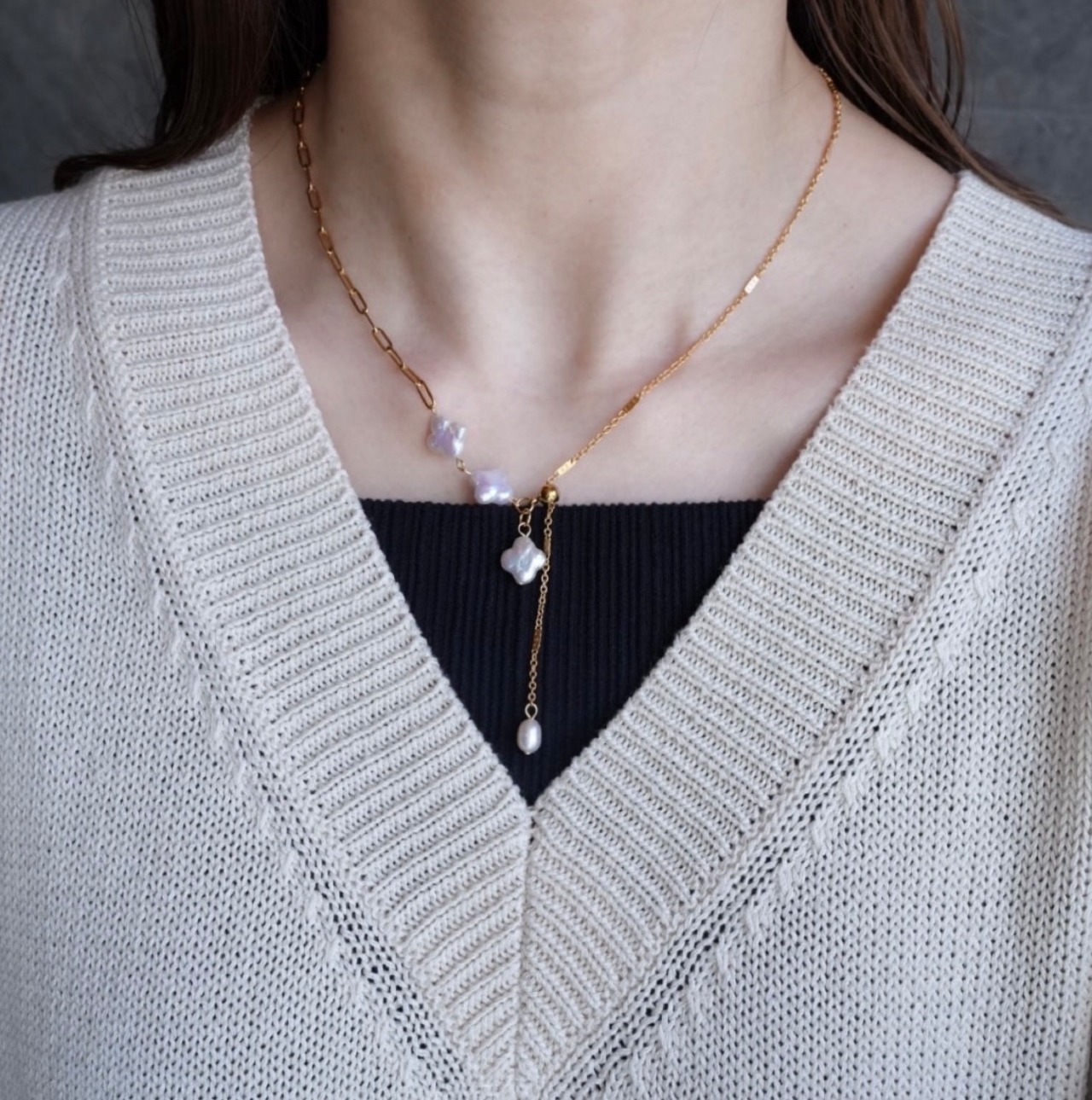当店で一番人気の「スライドボールネックレス」に、フラワーパールを贅沢にあしらった特別な一本ができました 。