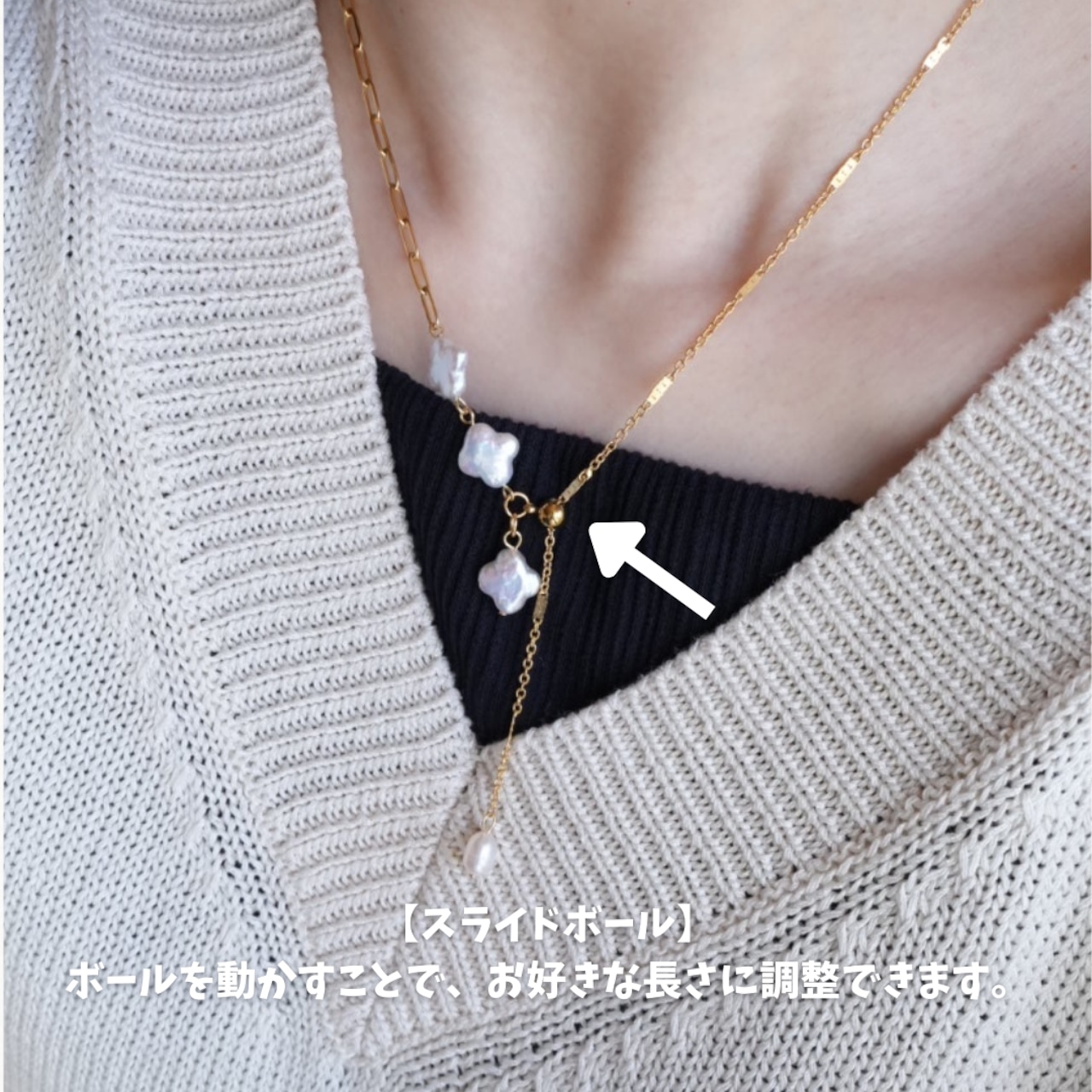 ネックレスについているスライドボールは、指で軽く動かすだけで長さを調整できる優れもの◎